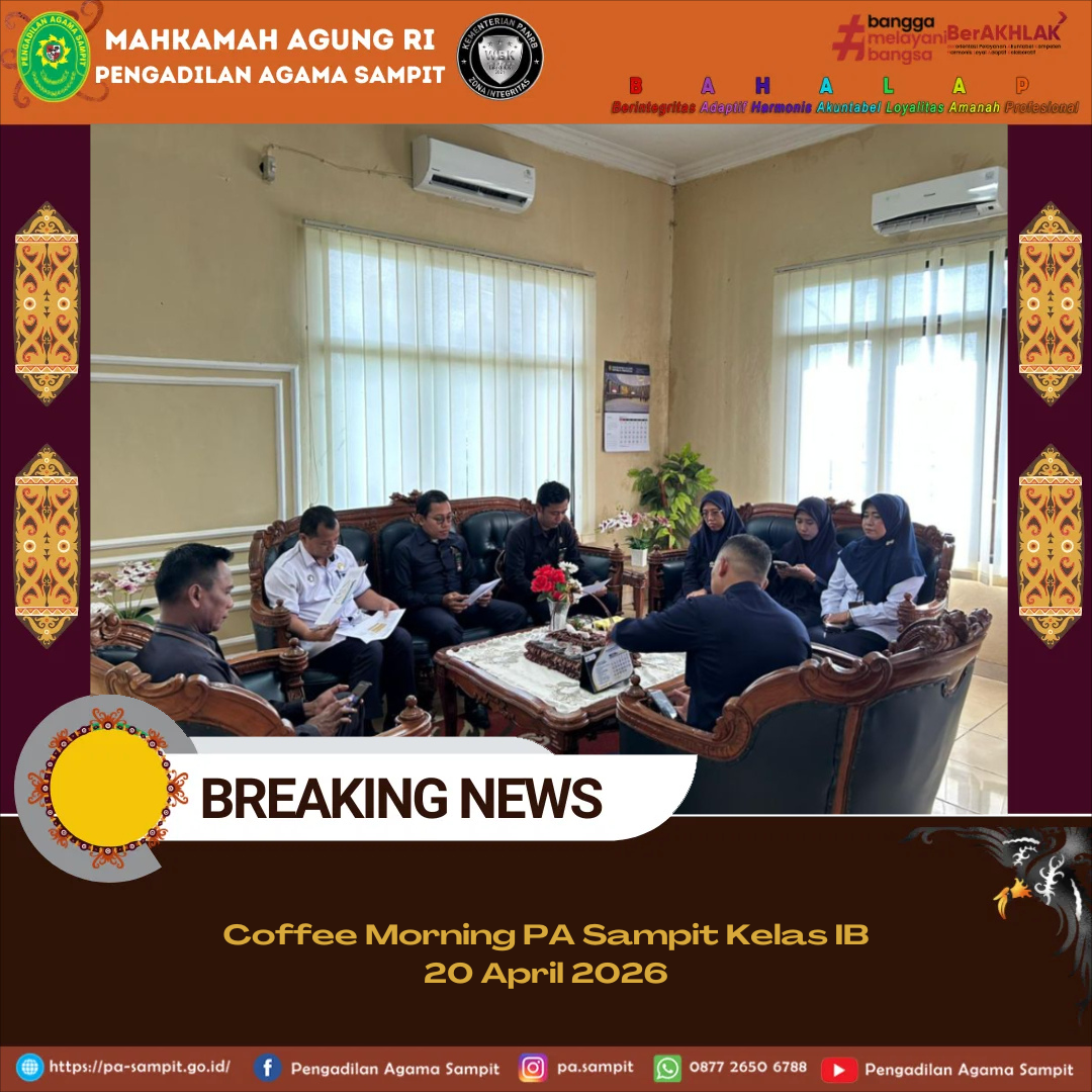 Sampit - Senin, 20 April 2026 Pengadilan Agama Sampit kembali melaksanakan coffee morning bertempat di Ruang Ketua Pengadilan Agama Sampit. Coffee morning dihadiri Ketua, Wakil Ketua, seluruh Hakim, Panitera dan Sekretaris. Acara dimulai pada pukul 08.20 WIB