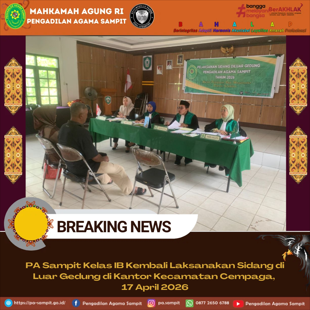 Sampit, 17 April 2026 – Pengadilan Agama (PA) Sampit Kelas IB kembali melaksanakan kegiatan sidang di luar gedung yang bertempat di Kantor Kecamatan Kota Parenggean, Kabupaten Kotawaringin Timur. Kegiatan ini menjadi momen kontinuitas pelaksanaan sidang di luar gedung di wilayah tersebut sebagai bentuk komitmen PA Sampit dalam mendekatkan pelayanan peradilan kepada masyarakat.