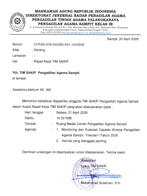Selasa, 21 April 2026 pukul 14.00 WIB Panitera Pengadilan Agama Sampit Muhammad Sulaiman, S.H. memimpin Rapat Tim SAKIP dengan agenda “Monev Realisasi Capaian Kinerja Pengadilan Agama Sampit Triwulan I Tahun 2026”, bertempat di Ruang Media Center. Rapat dihadiri oleh TIM SAKIP Tahun 2026 terdiri dari Panitera, Sekretaris, para Panitera Muda dan para Kepala Sub Bagian/Plt. Kepala Sub Bagian. Rapat ini rutin dilaksanakan per triwulan demi menjaga kestabilan kinerja khususnya yang termuat dalam Indikator Kinerja Utama (IKU) Pengadilan Agama Sampit tahun 2026 dan meningkatkannya setiap saat, sehingga dapat terpantau seberapa capaian kinerja apakah sudah mencapai target atau belum. Pada kesempatan tersebut Panitera memaparkan capaian kinerja Triwulan I bahwa ketiga sasaran strategis Pengadilan Agama Sampit yang terdiri dari masing-masing terdiri dari indikator kinerja hampir semuanya telah mencapai target yang ditetapkan 100%, bahkan ada yang melebihi target seperti Persentase perkara yang berhasil diselesaikan melalui mediasi target 41% realisasi 47,62%, Indeks kepuasan pengguna layanan pengadilan berdasarkan standar layanan yang ditetapkan target 3,80% realisasi 3,89%.